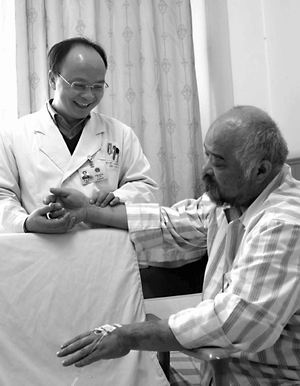 小護士拿一件病號服貼在李琦身上比劃:“讓我看看長短,這是專門給你做的,不知道縮水了沒有!彼怨陨斐龈觳脖葎澮环至闷鹕弦乱聰[,指著褲子上一拃長的口子說:“人實在,系褲子都使勁。一勒,破了。我要穿有松緊帶的新褲子!”一會兒,合他要求的褲子送來了。(郭愛娣 吳敏)