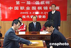 首屆“倡棋杯”職業(yè)圍棋錦標賽決賽三月二十七日在上海應氏圍棋基金會進行,由孔杰七段(右)對陣王磊八段(左),應昌期圍棋教育基金會董事長應明皓親自擔任裁判長。作者:湯彥俊