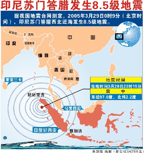 印度尼西亞蘇門答臘島附近海域當(dāng)?shù)貢r(shí)間28日23時(shí)9分(北京時(shí)間29日零時(shí)9分)發(fā)生里氏8.5級強(qiáng)烈地震,印度洋沿岸國家隨即發(fā)出了海嘯警報(bào)。印尼警方說,地震可能已造成數(shù)百人死亡或失蹤。