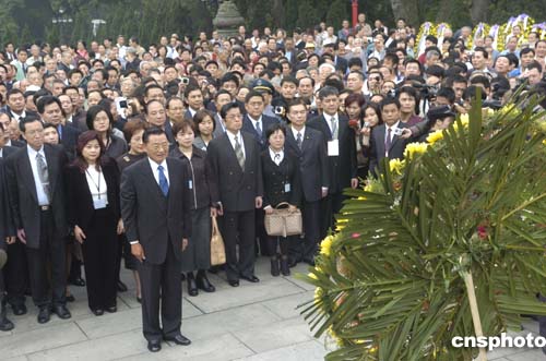 上午十點,拜謁儀式正式開始。江丙坤代表國民黨主席連戰(zhàn)及全體國民黨黨員向烈士敬獻花圈。參訪團所有成員均向烈士三鞠躬致敬。隨后宣讀的祭文中寫道:“壯哉先烈,死以報國,身毀名榮,英風義烈,永為世率!