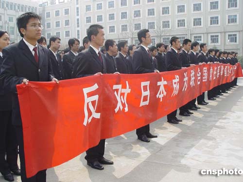 三十一日上午,河南檢察職業(yè)學(xué)院的數(shù)千名學(xué)生在該校的廣場上舉行了以“維護世界和平,反對日本加入聯(lián)合國常任理事國”為主題的大型簽名活動,以此表示對日本要求加入聯(lián)合國常任理事國的不滿。圖為活動中,學(xué)生們自發(fā)打起“反對日本成為聯(lián)合國常任理事國”的橫幅。作者:史寶銀