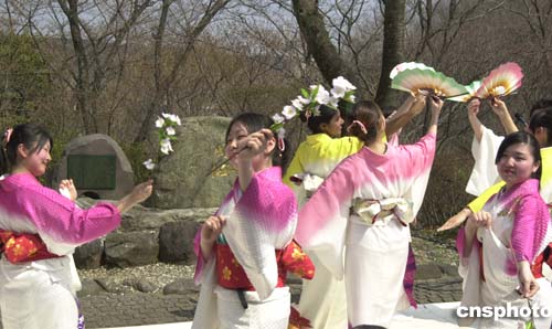 | 日本創(chuàng)價(jià)大學(xué)校園內(nèi)三日舉行傳統(tǒng)的“周櫻”觀賞會(huì)。三十年前,在創(chuàng)價(jià)學(xué)會(huì)會(huì)長(zhǎng)池田大作的提議下,首批留學(xué)創(chuàng)價(jià)大學(xué)的六名中國(guó)留學(xué)生種植櫻花樹(shù)苗,被命名為“周櫻”。此后,每年春暖花開(kāi)時(shí)節(jié)的“周櫻”觀賞會(huì),便成為此間日本友人緬懷周恩來(lái)的一項(xiàng)傳統(tǒng)活動(dòng)。圖為在“周櫻”紀(jì)念碑前,創(chuàng)價(jià)大學(xué)學(xué)生手持櫻花翩翩起舞。作者:王健