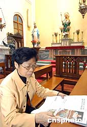 澳門一位女士在主教堂內(nèi)追思教皇,三日,當澳門信徒得悉教皇保羅二世離世后,他們紛紛到教堂用各種形式悼念教皇。作者:梁永強