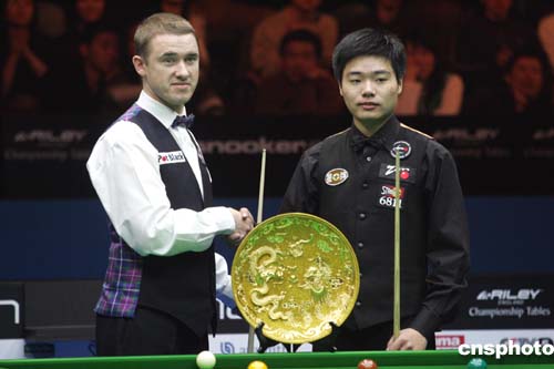 二零零五年四月三日,剛剛度過十八歲生日的中國(guó)神童丁俊暉在北京海淀體育館舉行的2005中國(guó)斯諾克公開賽決賽中迎戰(zhàn)昔日金童、前世界第一斯蒂芬·亨德利,這是中國(guó)選手在國(guó)際斯諾克排名賽上的最佳戰(zhàn)績(jī)。作者:武仲林