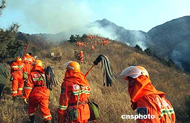 4月4日,河北省井徑縣南王莊鄉(xiāng)蘆莊村的金華寺山旅游景點(diǎn),發(fā)生大面積火災(zāi)。河北省森林防火應(yīng)急分隊(duì)武警緊急出動(dòng)300余名兵力趕赴火災(zāi)現(xiàn)場(chǎng),經(jīng)過(guò)5個(gè)多小時(shí)的激烈?jiàn)^戰(zhàn),終將熊熊大火撲滅。據(jù)查大火由清明燒紙引發(fā)。圖為武警官兵奔赴目的地。作者:余洪恩