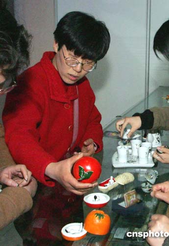 新近在上海著名的旅游風(fēng)景區(qū)——浦東陸家嘴觀光隧道內(nèi),一種顯示男女歡愛(ài)動(dòng)作的、號(hào)稱“嫁女壓箱底”之物的旅游紀(jì)念品吸引了游客視線,它也是正在該地舉行的“中華性文化展覽”紀(jì)念品之一。圖為兩位中年婦女正在精心挑選該旅游紀(jì)念品。作者:潘索菲