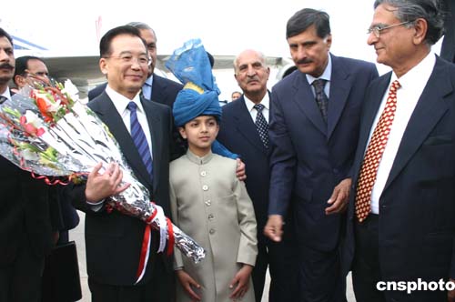 中國國務(wù)院總理溫家寶傍晚抵達(dá)伊斯蘭堡空軍機(jī)場,開始對(duì)巴基斯坦進(jìn)行為期三天的正式訪問。圖為溫家寶與給他獻(xiàn)花的巴基斯坦少年親切合影。