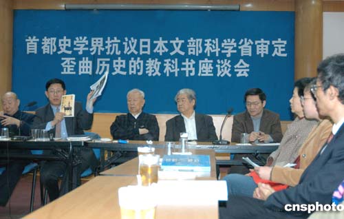 | 四月六日,“首都史學(xué)界抗議日本文部科學(xué)省審定歪曲歷史的教科書座談會”在北京舉行。來自首都史學(xué)界的專家學(xué)者就日本文部科學(xué)省四月五日審定通過了歪曲歷史的二零零六版《新歷史教科書》事件進(jìn)行座談,并一致認(rèn)為日本政府應(yīng)當(dāng)高度重視亞洲近鄰的正義呼聲,本著對歷史認(rèn)真負(fù)責(zé)的態(tài)度,誠實(shí)履行反省侵略歷史的承諾,切實(shí)妥善處理這一問題。作者:徐曦弋