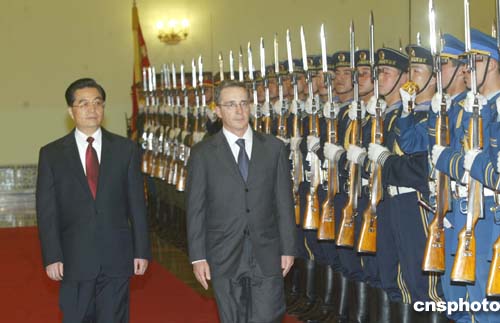四月六日,中國(guó)國(guó)家主席胡錦濤在北京人民大會(huì)堂主持儀式,歡迎哥倫比亞總統(tǒng)烏里韋來(lái)華訪問(wèn)。作者:史利