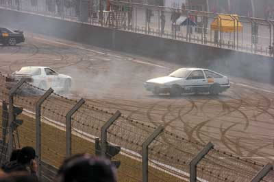 幾萬名觀眾觀看了《頭文字D》電影中的飄移比賽,在電影中使用的四輛賽車AE86、EVO、FC、GTR專門從香港運(yùn)送過來,四輛賽車在跑道中呼嘯著做各種轉(zhuǎn)彎和飄移的動(dòng)作,隨著一道道青煙的升起,全場(chǎng)立即沸騰起來。
