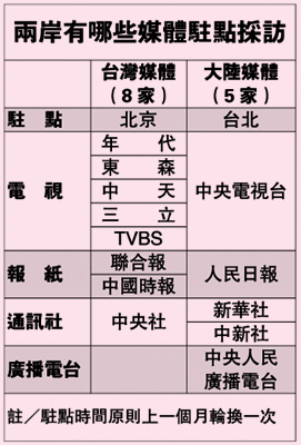 兩岸開放媒體記者采訪,大陸方面先于臺(tái)灣。1996年12月,國(guó)臺(tái)辦公布“關(guān)于臺(tái)灣記者來祖國(guó)大陸采訪的規(guī)定”,正式開放臺(tái)灣媒體到大陸采訪,目前有8家臺(tái)灣媒體派記者原則以1個(gè)月一輪方式,定期到北京采訪。