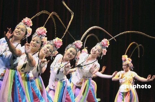 二00五年美國(guó)中華演藝學(xué)院華裔學(xué)生匯報(bào)公演四月十七日在加州圣塔克拉拉大學(xué)舉行。圖為華裔學(xué)生們表演中國(guó)古典舞《俏花旦》。作者:陳鋼