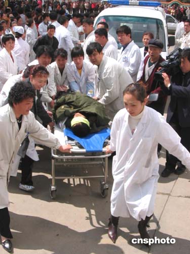 四月二十四日,吉林省吉林市蛟河奶子山騰達(dá)煤礦發(fā)生透水事故,六十九名礦工被困井下。經(jīng)連夜搶救,至二十五日十四時(shí),已有三十九人獲救。圖為醫(yī)務(wù)人員正將獲救礦工緊急送往醫(yī)院進(jìn)行救治。作者:呂陽(yáng)