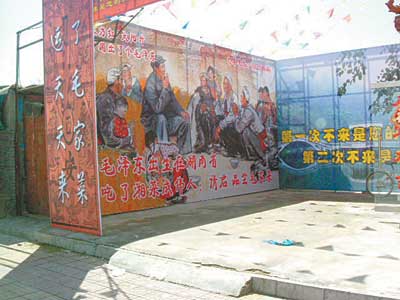 北京海淀區(qū)一家酒樓把毛主席與農(nóng)民座談時(shí)的場景設(shè)計(jì)為廣告牌,懸掛在店外,并寫著“吃了湘菜成偉人”的廣告語。