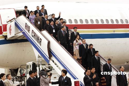 中共中央臺辦主任陳云林、中共北京市委副書記龍新民、在京臺商代表和北京各界代表列隊在停機(jī)坪熱烈歡迎連戰(zhàn)一行。