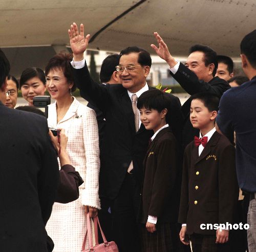 在機(jī)場停機(jī)坪,連戰(zhàn)在夫人方瑀,中國國民黨副主席吳伯雄、林澄枝、江丙坤,秘書長林豐正等陪同下發(fā)表簡短講話。