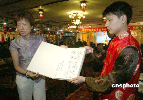 四月二十八日晚,中國國民黨主席連戰(zhàn)來到北京老舍茶館喝茶看戲,并為茶館題字:“振興茶文化,祥和兩岸情”。作者:廖文靜
