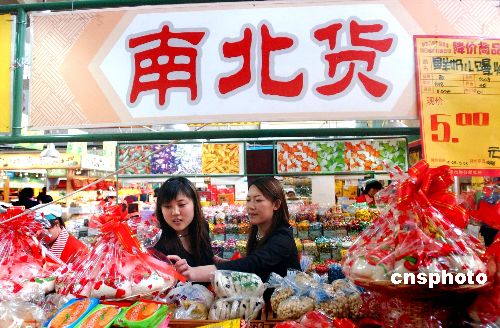 “五一”黃金周將至,北京商業(yè)部門為節(jié)日準(zhǔn)備了充足的商品。4月29日,崇文門菜市場(chǎng)內(nèi)來自全國(guó)各地的特色食品琳瑯滿目,供顧客選購。作者:李樹貴