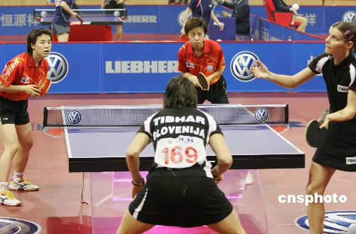 五月一日,第四十八屆世乒賽在上海體育館全面打響,中國選手王楠、張怡寧在首先進行的女子雙打比賽中,以四比零輕松戰(zhàn)勝來自斯洛文尼亞的一對選手哈羅絲和托度洛維奇,順利晉級下輪。作者:湯彥俊