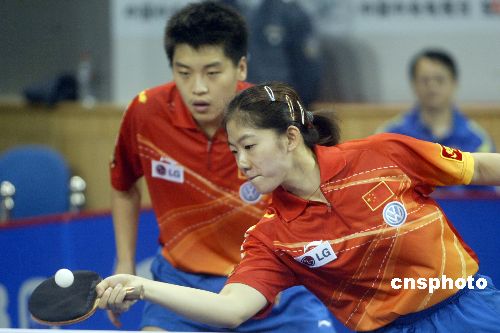 五月二日,在上海體育館舉行的第四十八屆世界乒乓球錦標(biāo)賽進(jìn)入了第三天,混雙首場(chǎng)大戰(zhàn)全面打響,中國(guó)隊(duì)派出的五對(duì)選手悉數(shù)告捷。圖為中國(guó)選手郝帥、牛劍鋒(右)在比賽中。作者:盛佳鵬