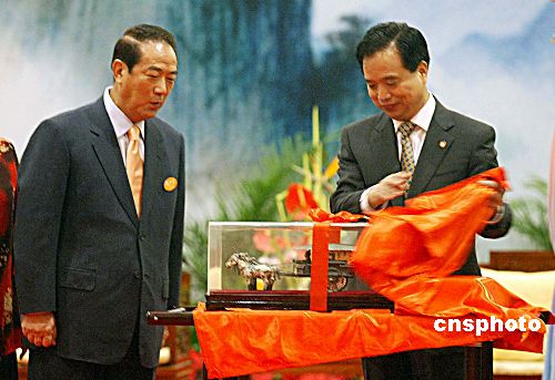 圖:李建國(guó)向宋楚瑜贈(zèng)送銅車馬