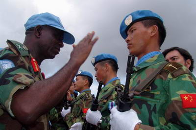 中新網5月6日電 據外交部網站消息,5月5日,中國人民解放軍第二批駐利比里亞維和部隊授勛儀式在利首都蒙羅維亞隆重舉行,聯(lián)合國利比里亞特派團(簡稱聯(lián)利團)代理行政長官穆薩大使、武裝部隊總司令奧瓦尼比中將和副總司令塔希爾少將、行政總監(jiān)斯托克斯等聯(lián)利團高級官員,中國駐利大使林松添等使館主要外交官,各國駐利維和部隊司令、軍事和民事觀察員及民事警察代表等近500人出席儀式。中國維和部隊領隊唐倫興上校、林松添大使和穆薩大使分別致辭。穆薩大使代表聯(lián)利團檢閱了中國維和部隊儀仗隊,并同聯(lián)利團主要官員向中國維和官兵頒發(fā)聯(lián)合國維和勛章。