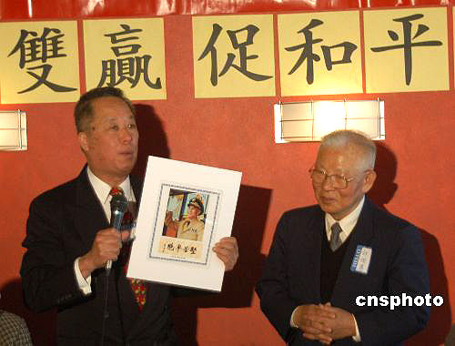 當(dāng)?shù)貢r(shí)間五月七日,華盛頓“榮光會(huì)”會(huì)長(zhǎng)李昌緒(左)向臺(tái)灣“新同盟會(huì)”會(huì)長(zhǎng)許歷農(nóng)(右)贈(zèng)送照片。許歷農(nóng)曾經(jīng)擔(dān)任國(guó)民黨軍隊(duì)高級(jí)將領(lǐng),幾年前因不滿李登輝而退出國(guó)民黨的許歷農(nóng)最近又回到國(guó)民黨。作者:余東暉