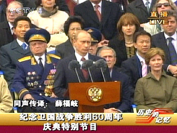 5月9日,俄羅斯在莫斯科紅場舉行紀念衛(wèi)國戰(zhàn)爭勝利60周年慶典。圖為俄羅斯總統(tǒng)普京發(fā)表講話。(央視截圖)