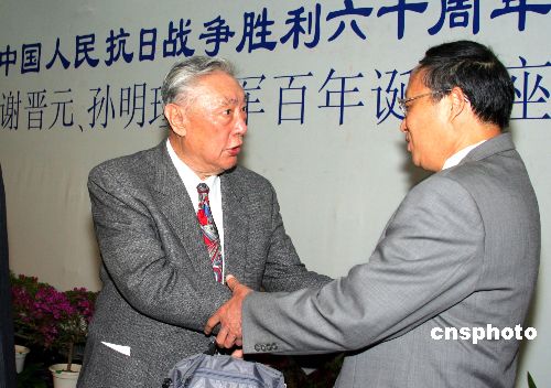 中新社上海五月十日電 (記者許曉青)適逢世界反法西斯戰(zhàn)爭勝利六十周年,曾參與中國抗日戰(zhàn)爭的諸位名將后裔和經(jīng)歷過抗戰(zhàn)的數(shù)十位黃埔老兵今天會聚上海黃埔軍校同學(xué)會,紀(jì)念“八·一三”抗戰(zhàn)時期誓死保衛(wèi)四行倉庫的謝晉元將軍誕辰一百周年。