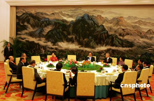 五月十一日晚,中共中央政治局常委曾慶紅在北京人民大會堂宴請親民黨主席宋楚瑜一行。作者:任晨鳴