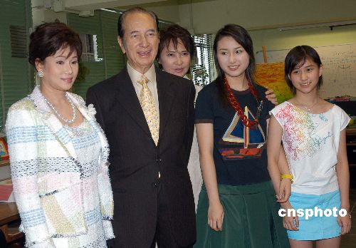 5月11日,港澳知名人仕何鴻燊博士與其三太何陳婉珍及兩名女兒在香港出席護(hù)苗基金會(huì)《護(hù)苗初中教育課程》首映會(huì),護(hù)苗基金會(huì)會(huì)長(zhǎng)蕭芳芳(中)并與何鴻燊一家四口合照。作者:鄧慶樂(lè)