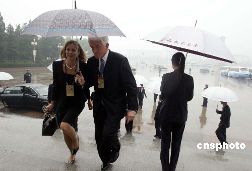 五月十六日晚,二○○五北京《財(cái)富》全球論壇在北京人民大會堂開幕。圖為參加開幕式的嘉賓冒雨抵達(dá)人民大會堂。作者:廖文靜