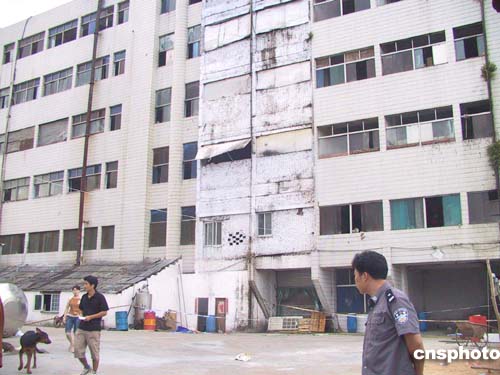 經(jīng)公安人員同意,記者獲準(zhǔn)在工廠院門前拍照。剛端起相機(jī),一條棕褐色大狼狗沖著記者大吠。而在另一幢樓門前,另一條狼狗正虎視耽耽盯著記者。這兩條大狼狗并沒有繩索牽絆,行動(dòng)自如。一位紅腫著雙眼的女孩聞聲走到門前,欲關(guān)門拒絕記者拍照。