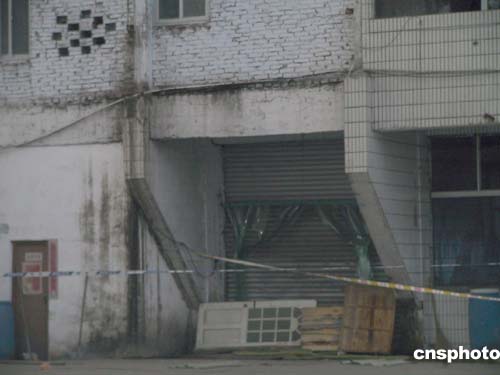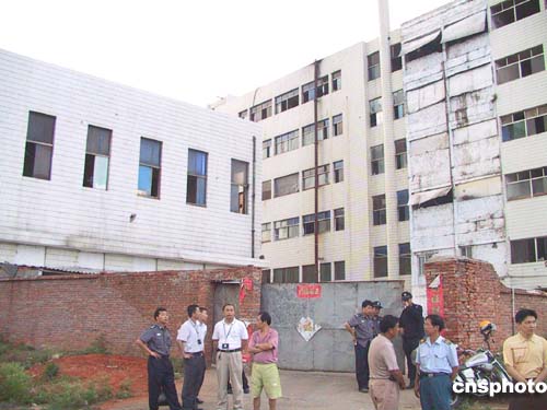 工廠由兩幢半拉子樓組成,樓房顯得很陳舊,一些窗戶甚至沒有玻璃,黑洞洞地呲著嘴。正對(duì)院門的大樓據(jù)說(shuō)是生產(chǎn)車間,高六層。大樓中間是電梯井房,但沒有安裝電梯。廢棄的電梯井房便被工廠當(dāng)作生產(chǎn)浸泡水池。一樓電梯井口的鐵制卷閘門被嚴(yán)密地拉下,前面還擋了一塊門板和一條警戒線。
