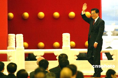 五月十六日晚,二○○五北京《財(cái)富》全球論壇在北京人民大會(huì)堂開(kāi)幕,中國(guó)國(guó)家主席胡錦濤出席開(kāi)幕式并作主題演講。作者:廖文靜