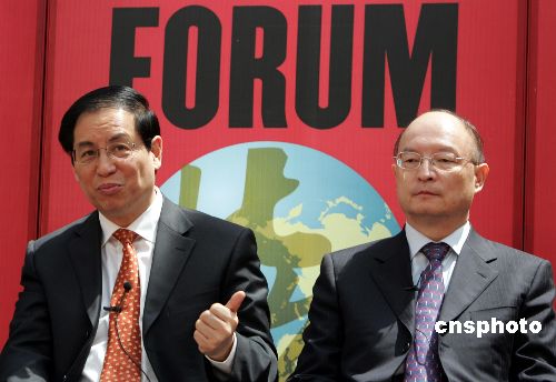2005北京《財(cái)富》全球論壇5月18日專(zhuān)門(mén)舉行“中國(guó)銀行業(yè)改革近況”會(huì)議,中國(guó)銀監(jiān)會(huì)主席劉明康(左)、國(guó)家開(kāi)發(fā)銀行行長(zhǎng)陳元用嫻熟的英語(yǔ)坦誠(chéng)地與世界各國(guó)業(yè)界人士對(duì)話(huà)。作者:任晨鳴
