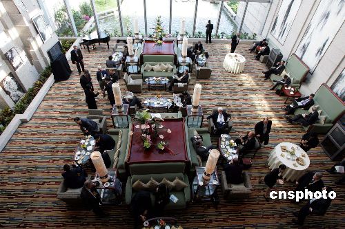 2005北京《財(cái)富》全球論壇5月18日繼續(xù)在北京釣魚臺(tái)國賓館舉行會(huì)議,與會(huì)嘉賓在芳菲苑舒適、優(yōu)雅的大廳內(nèi)輕松交流。作者:任晨鳴