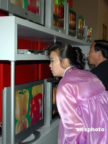 由朝鮮貿(mào)易省主辦的“第八屆平壤國際商品博覽會”五月十六日至十九日在朝鮮平壤三大革命展示館舉行,有來自世界各國的三百多家企業(yè)參展,這是朝鮮歷史上首次舉辦大規(guī)模的國際商務(wù)活動。圖為朝鮮人參觀中國生產(chǎn)的液晶電視展臺。作者:涵喬