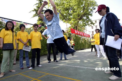 五月二十日,北京華文學(xué)院在北京舉行運(yùn)動(dòng)會(huì),來自十七個(gè)國(guó)家的二百多名學(xué)生以及全體教職工參加了趣味橫生的運(yùn)動(dòng)會(huì)。圖為學(xué)生們?cè)诎耸渍鄯蹬艿谋荣愔。作者:盛佳鵬