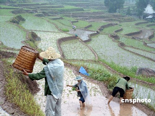| 5月20日,重慶市云陽縣紅獅鎮(zhèn)中心壩田園,當地群眾正在冒雨插秧。眼下,正值三峽庫區(qū)農村“雙搶”(大春搶種搶收)季節(jié),一年一度的水稻栽插處在節(jié)骨眼上。但2005年的三峽梅雨季節(jié)比常年來得早,半月前便呈現三天兩頭雨的“孩兒臉”氣候。為了不誤農時,峽江兩岸農村處處可見村民斗雨整田插秧的大忙景象。據了解,早到的多雨天氣對中高山及時出苗十分有利,但雨水也對秧苗固窩、勞作出行造成影響。雖然天公喜怒無常、冷熱頻換,人們對搶抓糧食生產的熱情不減。作者:饒國君