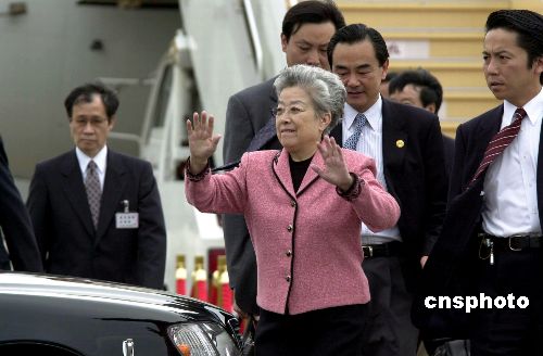 中國國務(wù)院副總理吳儀五月二十二日下午抵達東京羽田機場,繼續(xù)她的日本之行。圖為吳儀在機場向前來歡迎的當(dāng)?shù)厝A僑和留學(xué)生代表招手致意。作者:王健