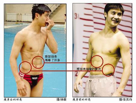 現(xiàn)在的田亮跟三月份不同,原有些模糊的腹部曲線清晰了很多,側(cè)面的肌肉更加緊湊,整個(gè)人也越發(fā)輕盈了,連他自己都贊嘆這是“苦練的結(jié)果”。