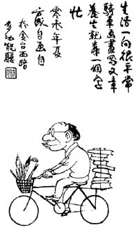 著名漫畫家方成有一幅“自畫自”的漫畫:一個大腦袋的方成,騎著一輛自行車,背后馱著一摞書,前面車筐里,插著幾支筆一卷畫。上題三句話:“生活一向很平常,騎車畫畫寫文章,養(yǎng)生就靠一個字,忙。”這是他對自己的生存狀態(tài)的自我描繪,走近他始知其言不虛。