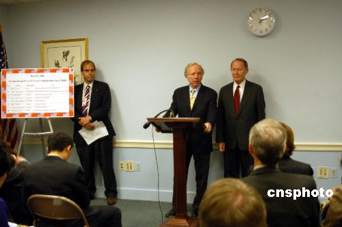 美國(guó)參議員喬.利伯曼(講話者)和拉馬爾.亞歷山大(前右一)二十五日聯(lián)合提出一項(xiàng)議案,要求美國(guó)聯(lián)邦政府從二00六年到二0一一年的五個(gè)財(cái)政年度內(nèi)撥款十三億美元,全面促進(jìn)美中在教育、學(xué)術(shù)、商業(yè)等方面的交流與接觸,并在美國(guó)中小學(xué)加強(qiáng)中文教育。作者:余東暉
