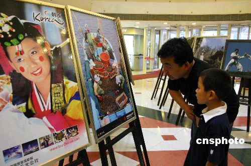 五月二十九日,“中國重慶·韓國友好周”在渝開幕。友好周系列活動之一“韓國文化旅游攝影展”在重慶解放碑開展。此次影展主要展示了韓國主要的文化與傳統(tǒng)、自然風景、旅游景區(qū)、民俗慶典等一百四十幅攝影作品。圖為一對父子興致勃勃地觀看影展。作者:郭晉嘉