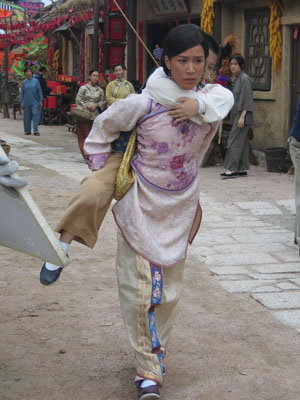 阿佘昨日一早與黎姿拍攝劇集《火舞黃沙》的文戲,接著便拍她與小男孩的戲份。劇情講述她背著小男孩向前跑,由于小男孩太重,阿佘很吃力,此鏡頭NG了七、八次,阿佘跑到氣喘叉腰。