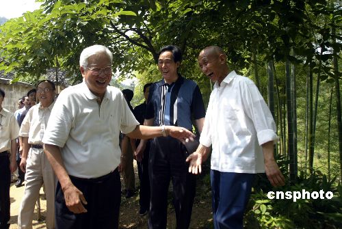 | 六月四日,全國政協(xié)副主席、全國政協(xié)副主席、中國致公黨中央主席羅豪才,率領(lǐng)致公黨中央的部分領(lǐng)導(dǎo)和一大批專家學(xué)者、實(shí)業(yè)家,由中共中央統(tǒng)戰(zhàn)部副部長黃躍金以及當(dāng)?shù)仡I(lǐng)導(dǎo)的陪同下,到安徽省安慶市潛山縣茶莊村進(jìn)行大別山區(qū)扶貧調(diào)研。圖為羅豪才(左)與當(dāng)?shù)卮迕裥φ劽撠氈赂灰约稗r(nóng)村果樹種植。作者:盛佳鵬