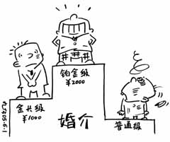 最近,南京出現(xiàn)一家“貴族婚介”,這家機(jī)構(gòu)將會(huì)員分成三個(gè)級別。首先是鉑金級,要求男性月收入在5000元以上,身高在1.75米以上,學(xué)歷本科以上,相貌端正談吐得體;女性月收入在3000元以上,身高在1.65米以上,學(xué)歷本科以上,漂亮。這個(gè)級別的會(huì)員年費(fèi)為2000元。其次是金卡,要求男性月收入在3000元,身高難1.72米,本科;女性月收入1500元,身高1.62米,大專。這個(gè)級別的年費(fèi)是1000元。最后是普通止背,不管男女,只要求收入在1000以上。按照規(guī)則,“上級”會(huì)員可以查看并約見“平級”和“下級”會(huì)員,“下級”會(huì)員去不能約見“上級”會(huì)員。這家“貴族婚介”的人員介紹,他們之所以將會(huì)員分級,目的只是想提高成功率。“我們并不是阻礙自由戀愛,但既然大家求助于婚介,借助一些社會(huì)上的潛規(guī)則有利于提高成功率。”