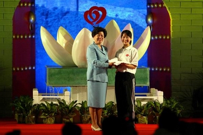 羅格、劉淇在儀式之初共同為北京奧運會志愿者標(biāo)識揭幕。羅格、劉淇端起中國古代盛大慶典禮儀活動時的用具——匜(音yi),向“花池”上方的“水立方”中澆水,“花蕾”緩緩開放,“花蕾”中央的北京奧運會志愿者標(biāo)識模型徐徐升起。
