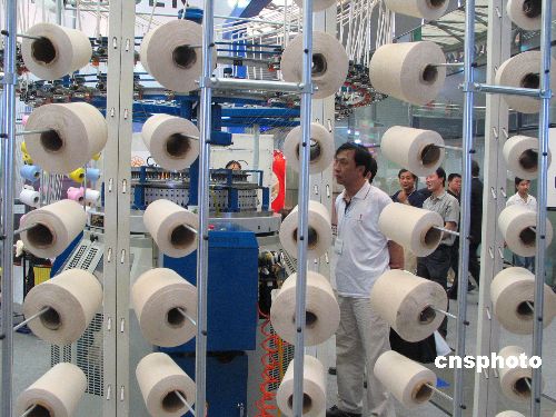 | 6月4日,國務(wù)院副總理吳儀在北京會見了來訪的美國商務(wù)部長古鐵雷斯,就共同關(guān)心的中美經(jīng)貿(mào)關(guān)系問題坦誠、深入地交換了意見。吳儀說,紡織品問題是中美經(jīng)貿(mào)關(guān)系發(fā)展中面臨的一個(gè)重大問題,如處理不好,將嚴(yán)重影響雙邊經(jīng)貿(mào)合作進(jìn)程,中方對此表示高度關(guān)注。圖為中國某紡織企業(yè)生產(chǎn)車間。作者:吳芒子